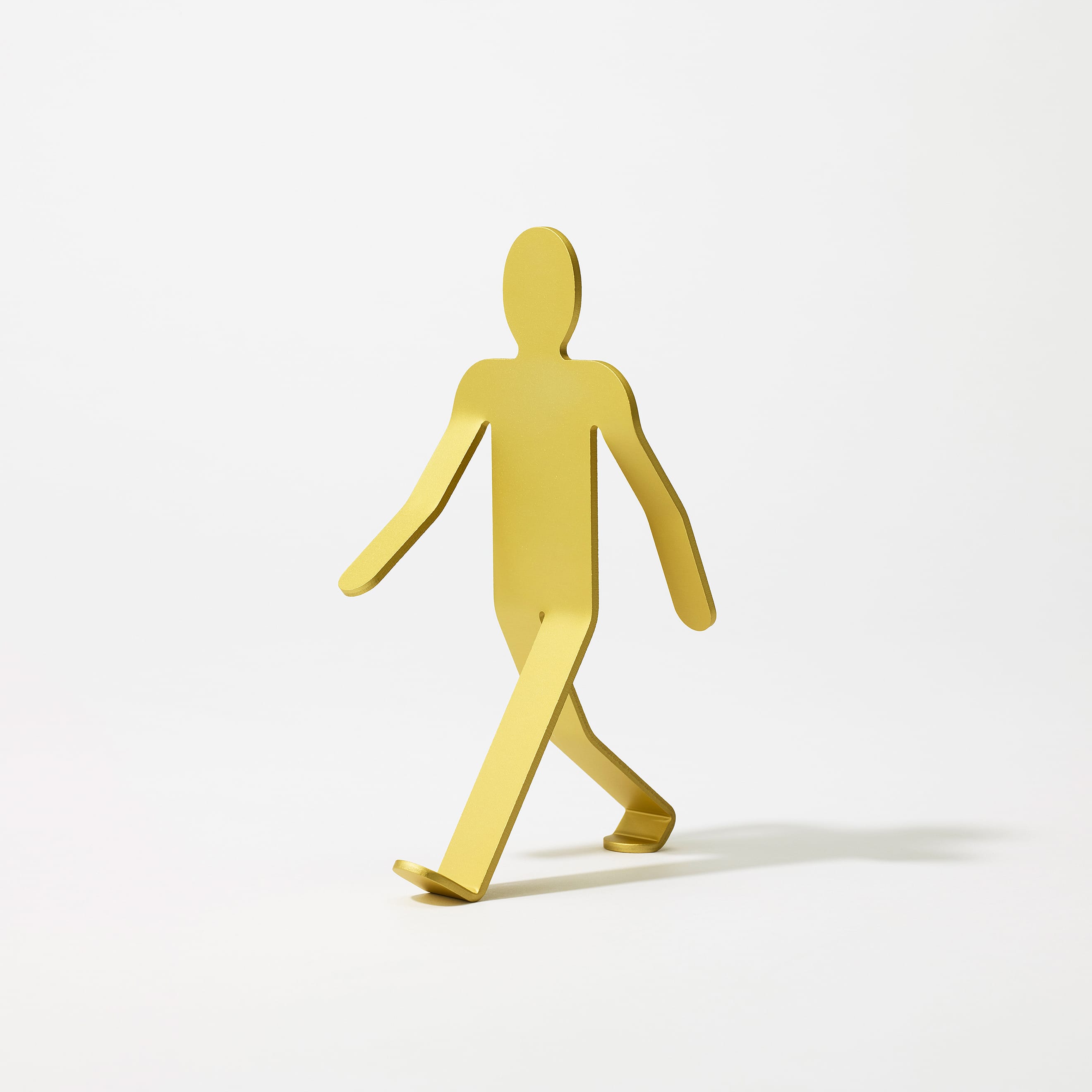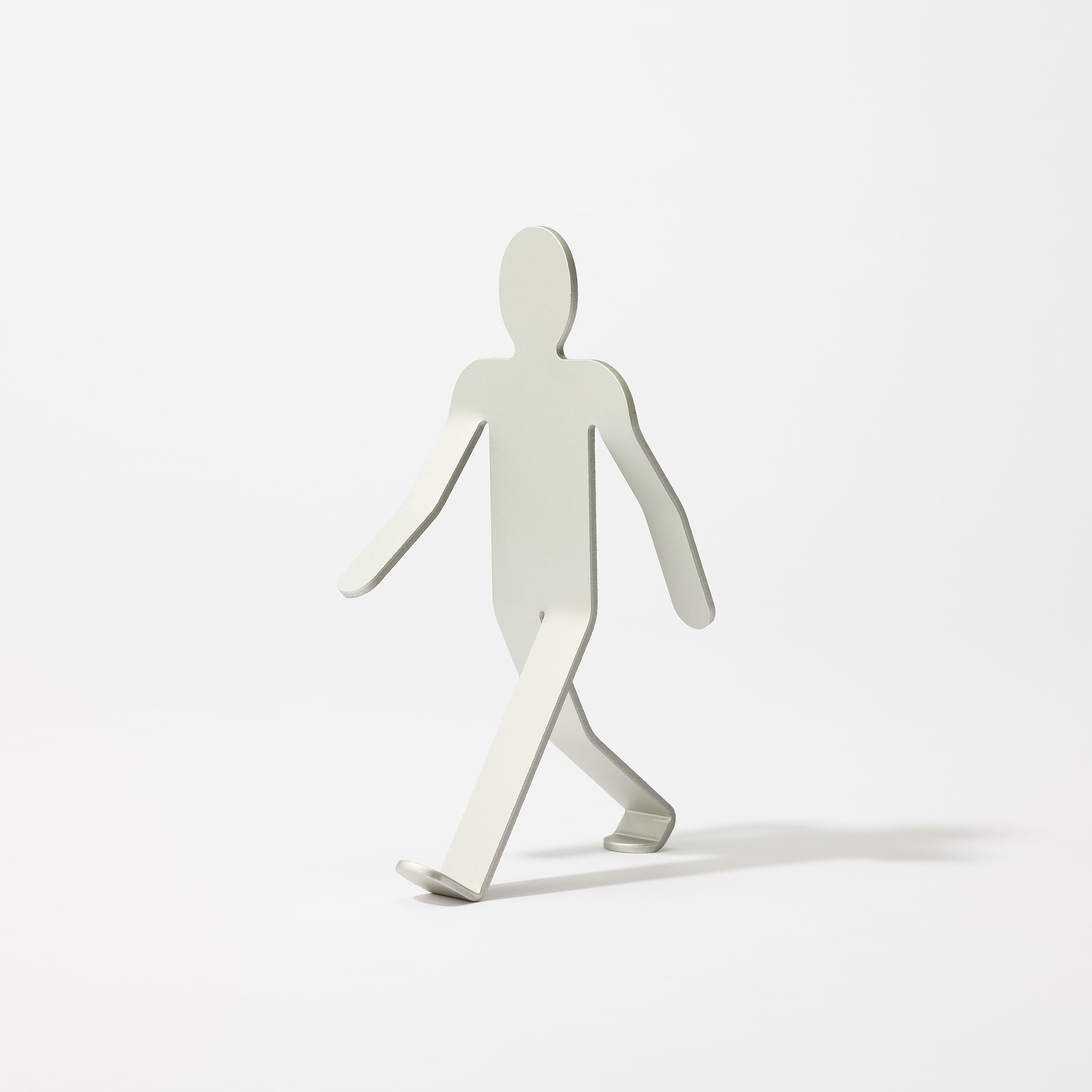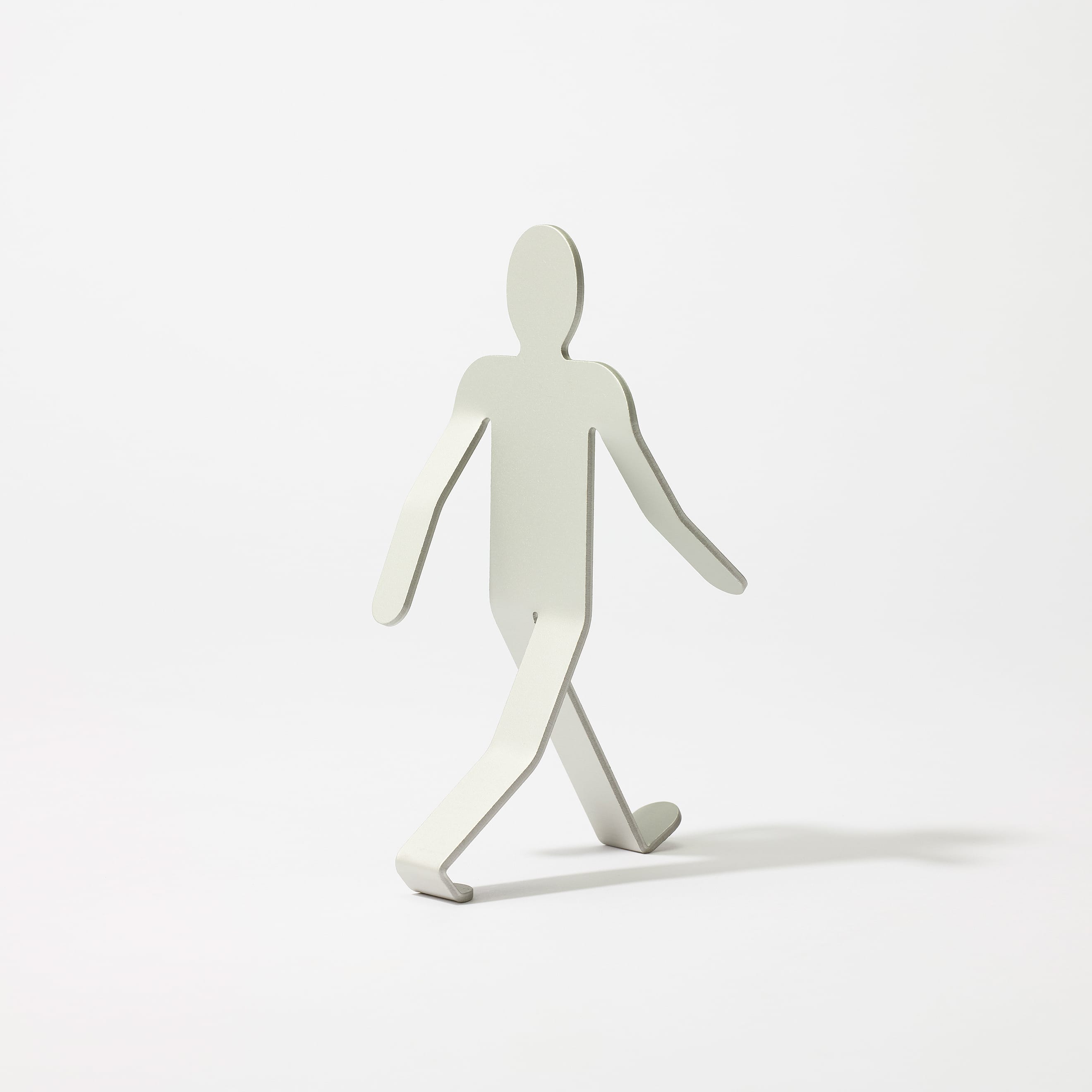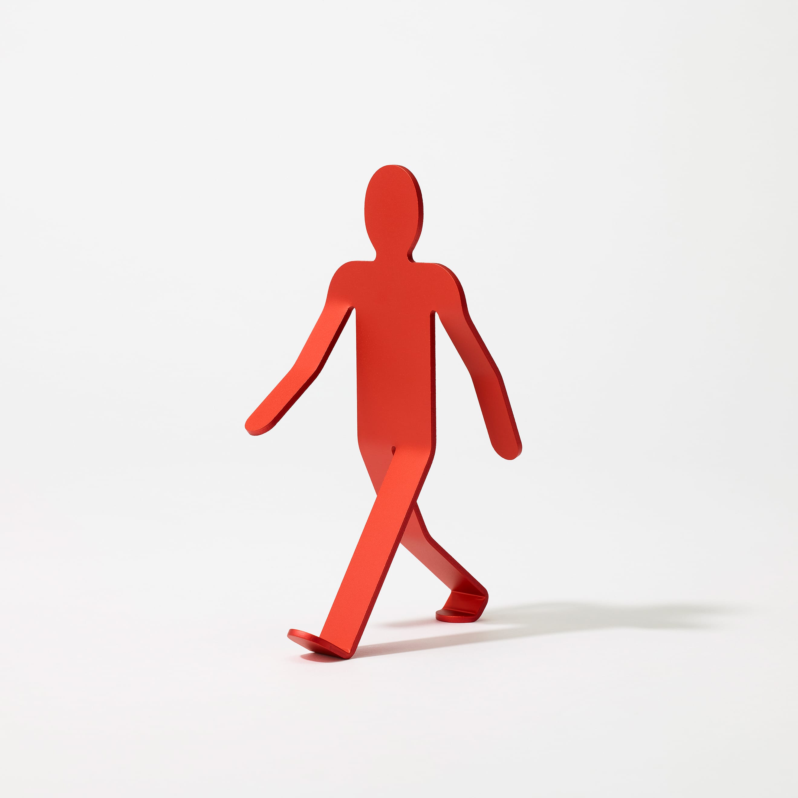 3mm厚のアルミニウム板を複雑に曲げ、2本足の繊細なバランスで立つWalking Manは、「金属に命を吹き込む」という発想から生まれました。いつでも、どこでも、どこへでも。Walking Manは、顔をあげ、大きく手を振り、足を開いて、まだ知らない世界に向かって、好奇心いっぱいに歩いています。その先に何があるのかわからなくても、元気と勇気をみんなにふりまきながら。もちろん、ときには倒れてしまうこともあるでしょう。それでもやっぱりいつも歩こうとする態度をやめることはないのです。
