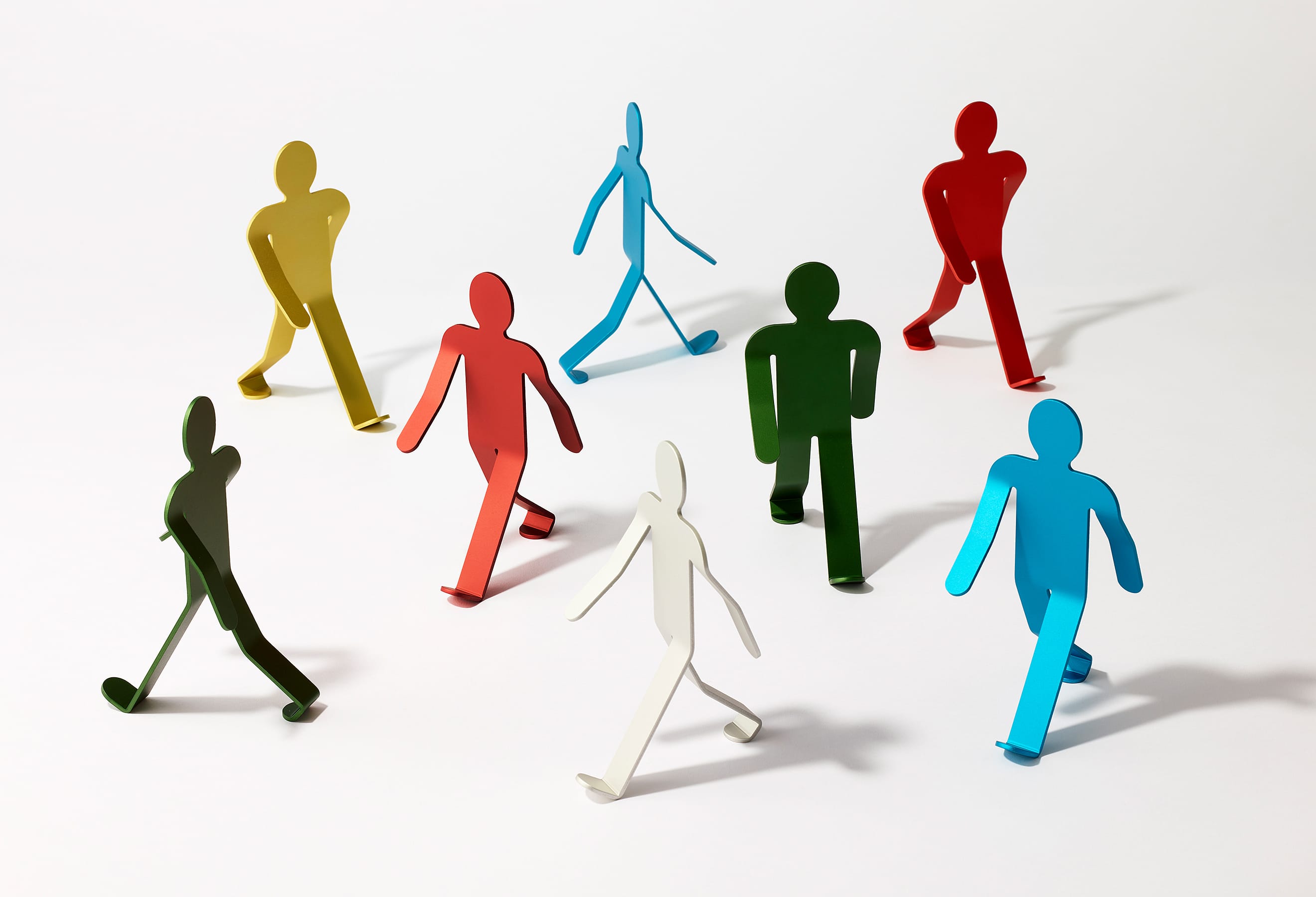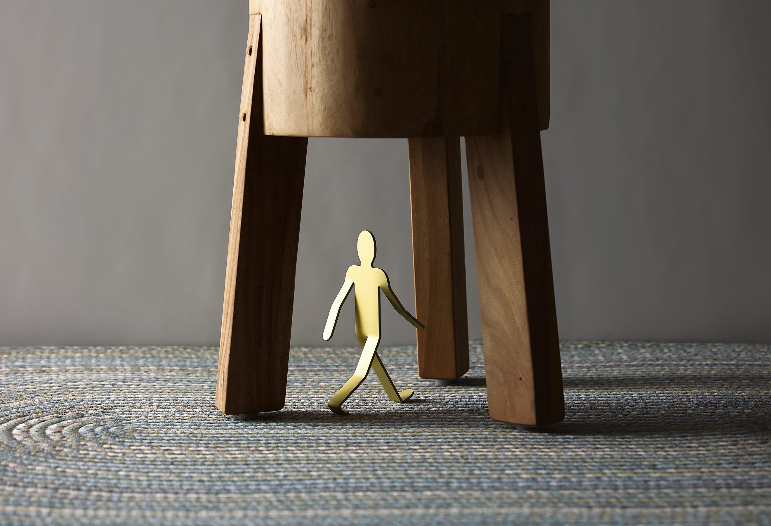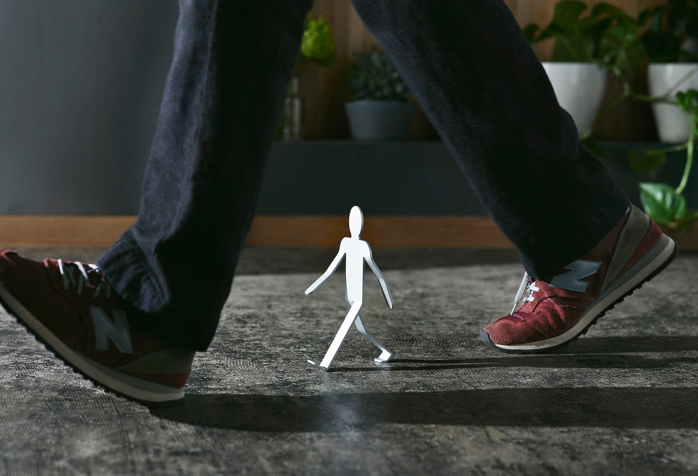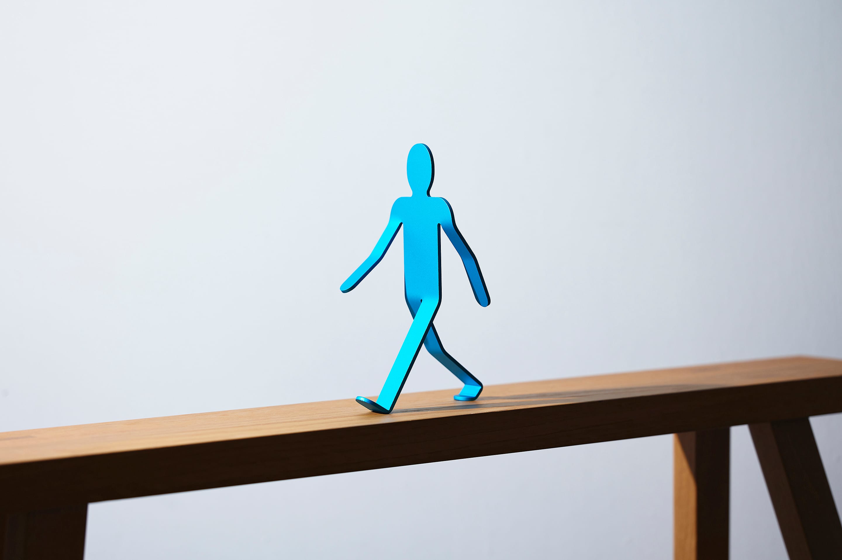 3mm厚のアルミニウム板を複雑に曲げ、2本足の繊細なバランスで立つWalking Manは、「金属に命を吹き込む」という発想から生まれました。いつでも、どこでも、どこへでも。Walking Manは、顔をあげ、大きく手を振り、足を開いて、まだ知らない世界に向かって、好奇心いっぱいに歩いています。その先に何があるのかわからなくても、元気と勇気をみんなにふりまきながら。もちろん、ときには倒れてしまうこともあるでしょう。それでもやっぱりいつも歩こうとする態度をやめることはないのです。