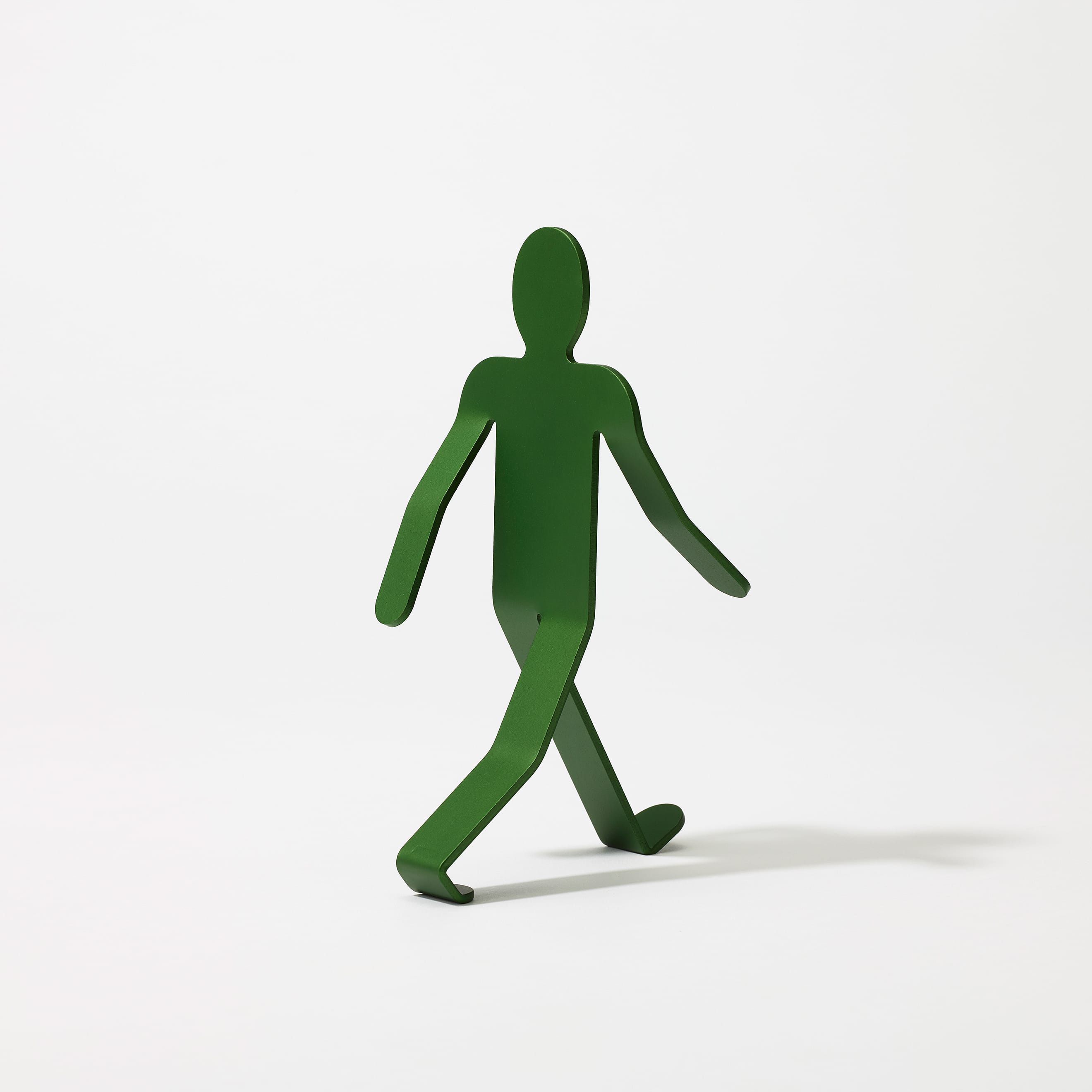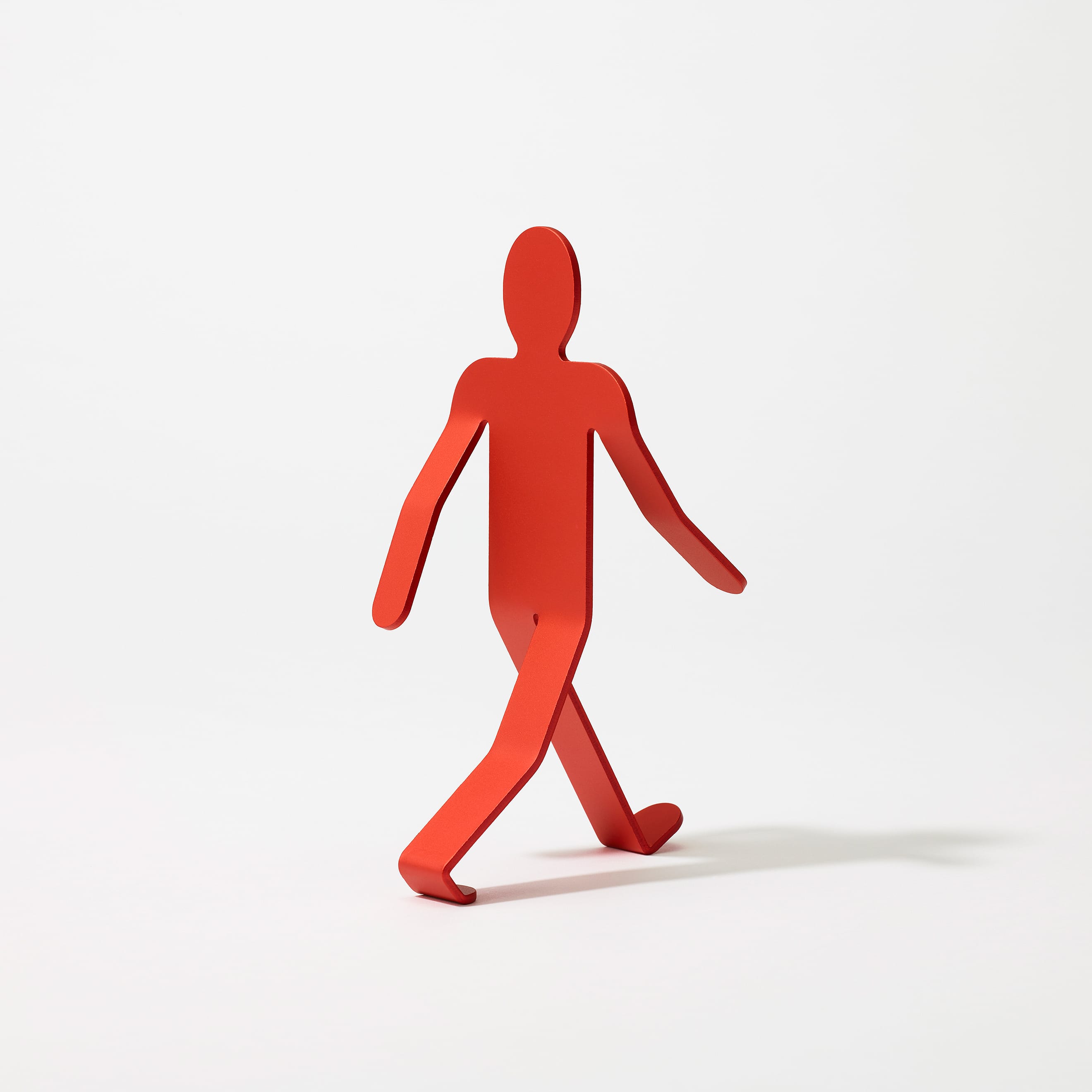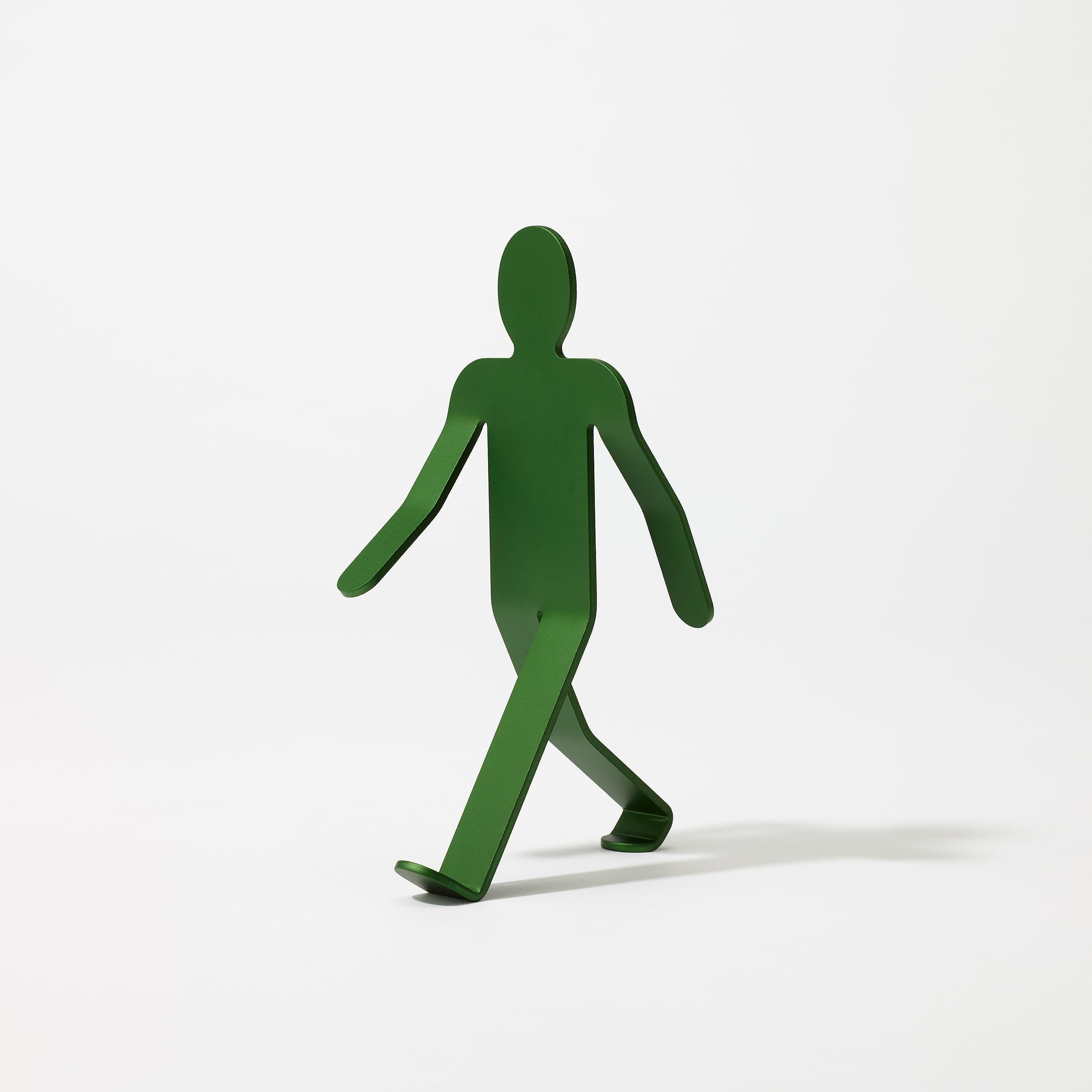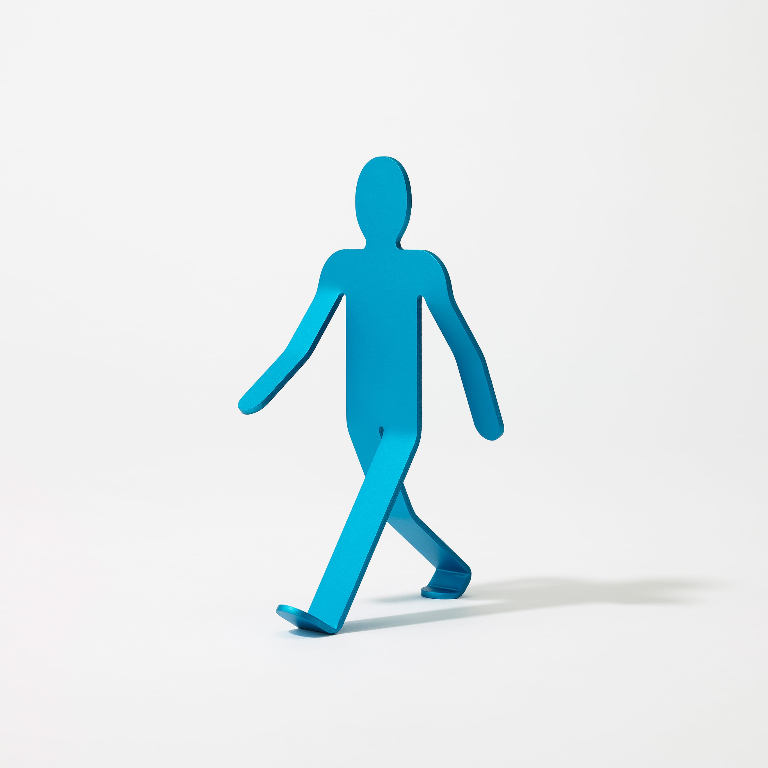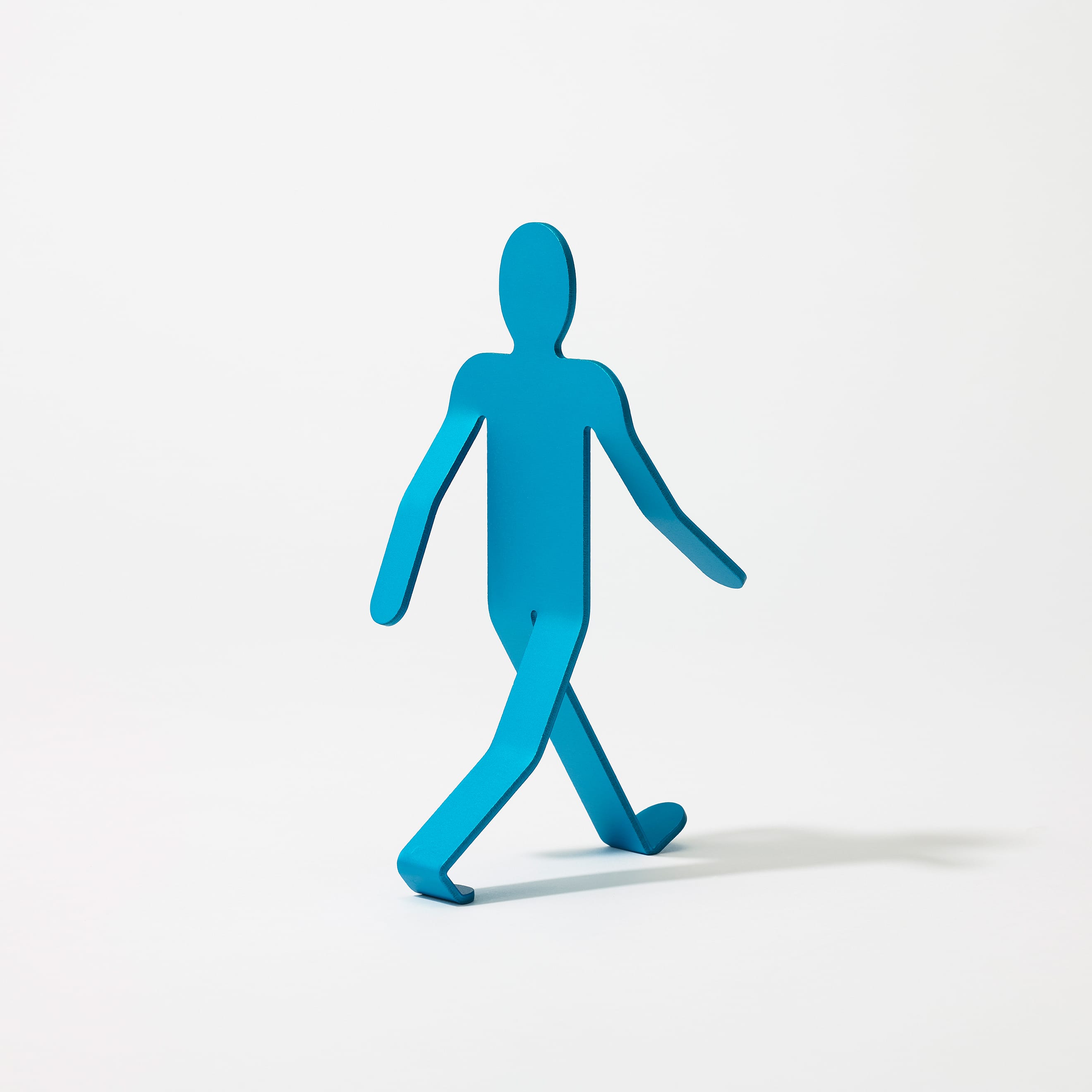 The Walking Man was born from the idea of breathing life into metal, and he does seem poised to set off on a journey somewhere. Fashioned from a 3mm sheet of aluminum, precisely bent and angled to create the delicate balance which keeps him upright, he strides through the world with his head held high and his arms swinging wide, eager to discover whatever lies ahead. He may tip over occasionally, but that won’t stop him—he’ll be up and walking again in no time.