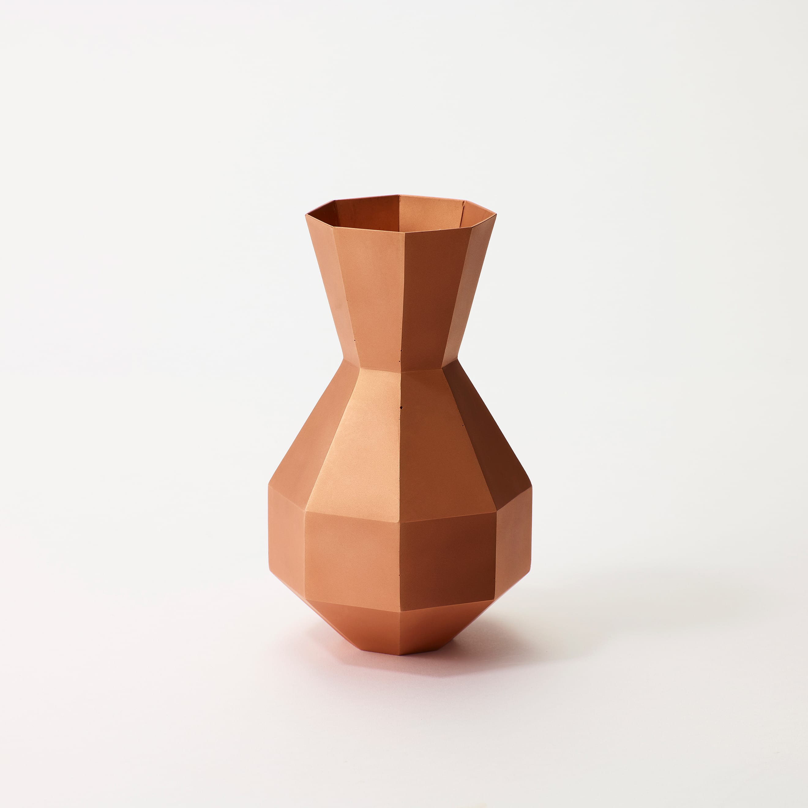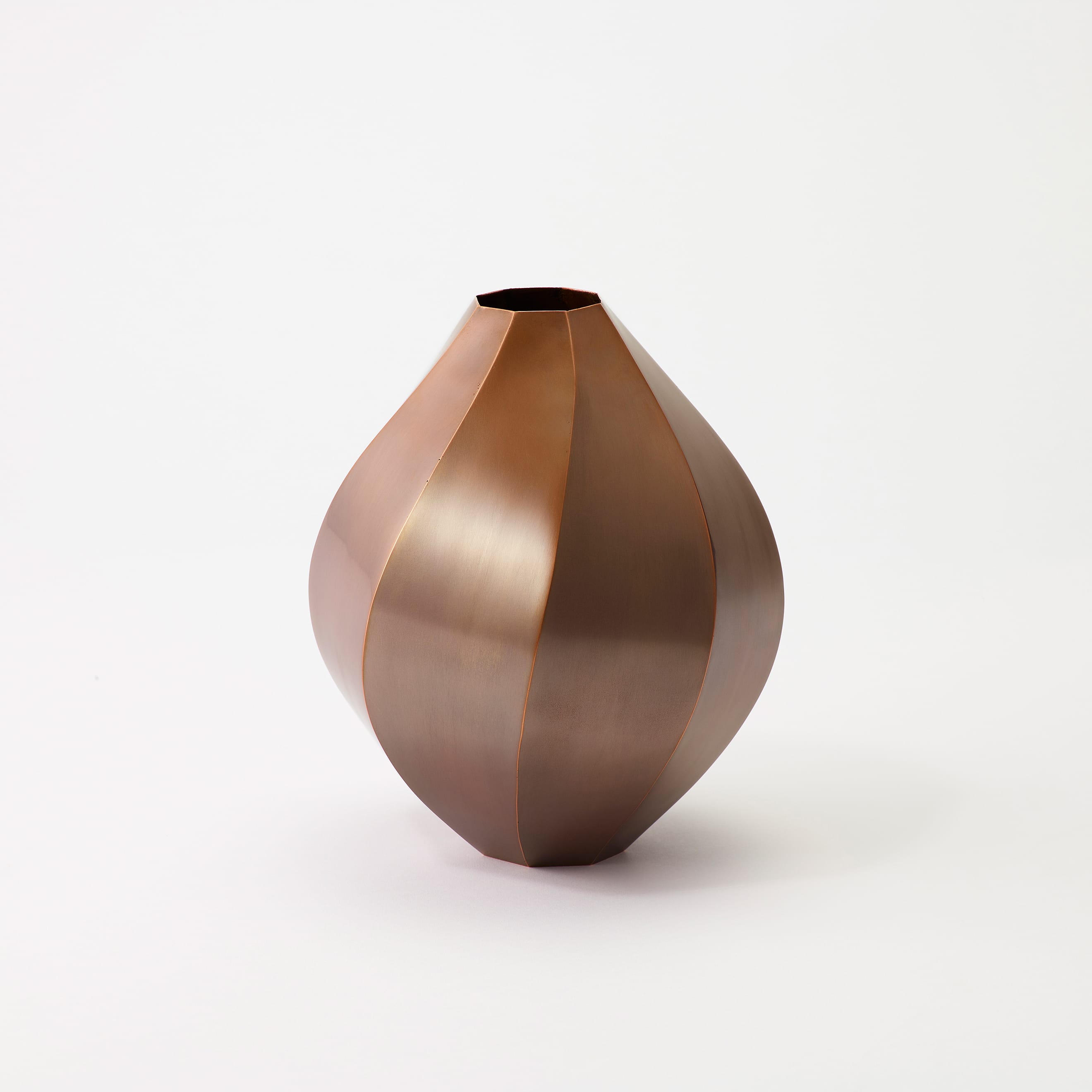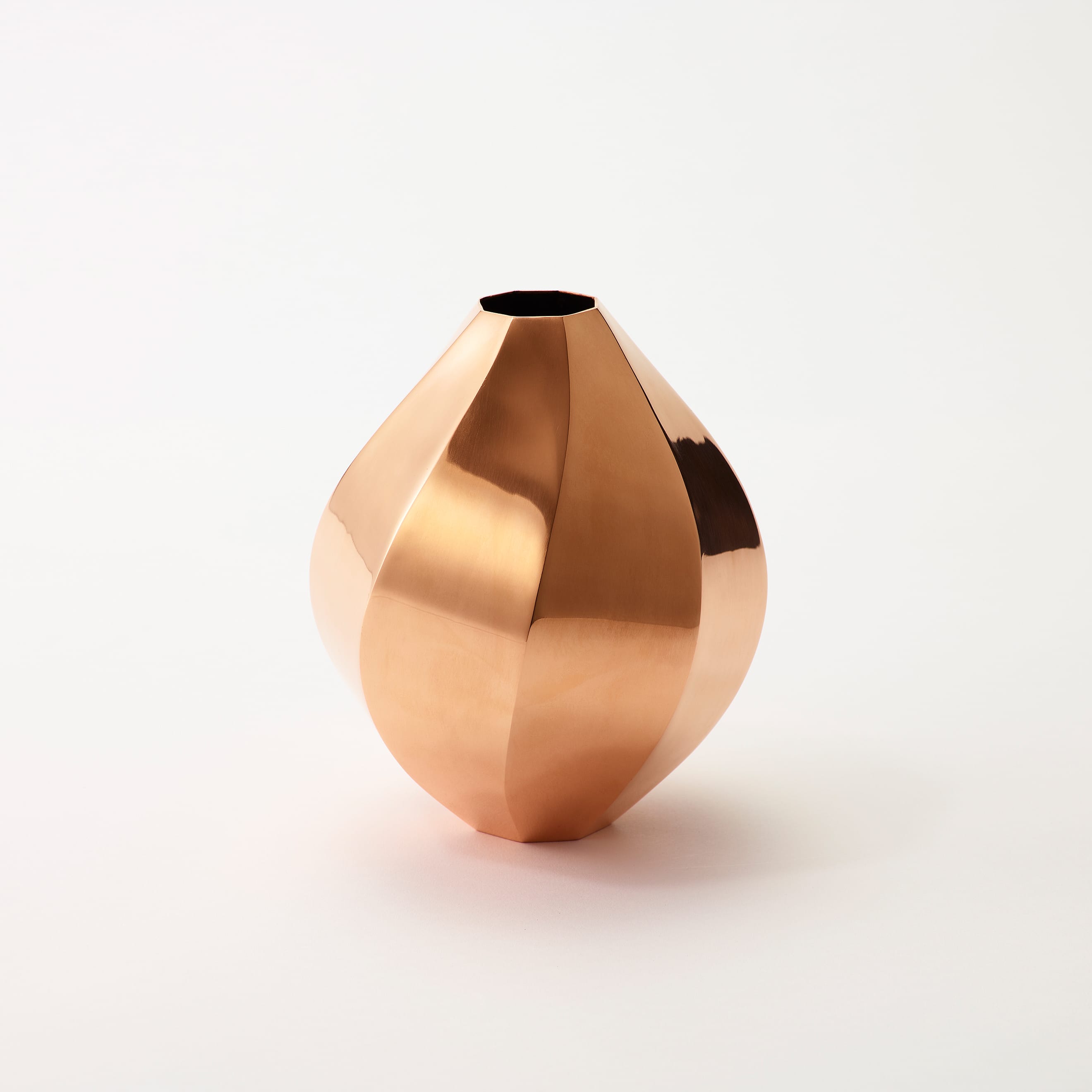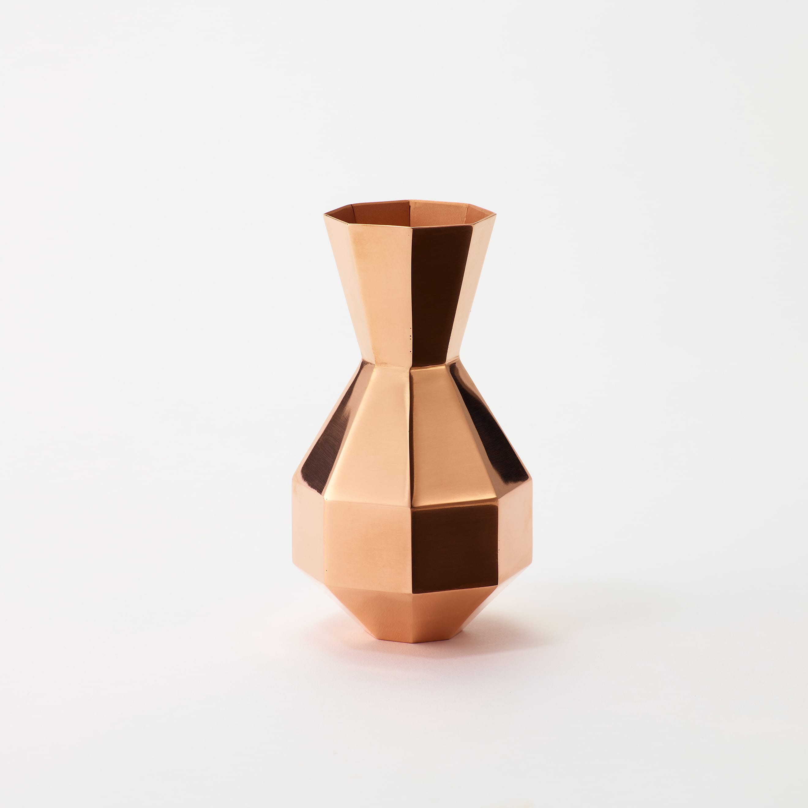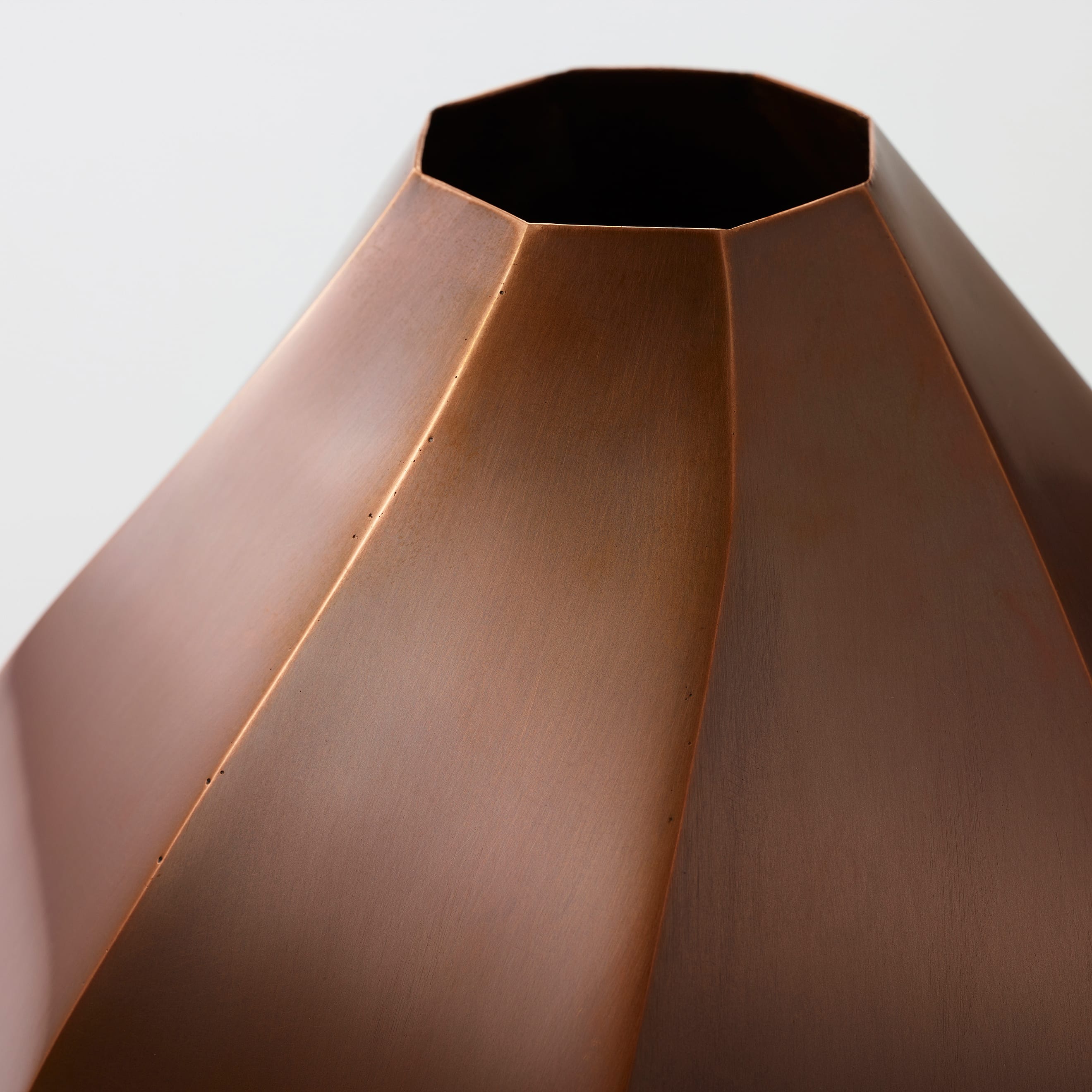 The Octagon Vase is a copper vase with an octagonal cross-section at every point along its beautiful form—but there is more to it than meets the eye. Copper is a material known for its antimicrobial properties; when it comes into contact with water, it releases copper ions which suppress the growth of bacteria and other microorganisms. This helps keep water clean and makes it easier for flowers to absorb nutrients, resulting in fresher, longer-lasting blooms. The octagon has also been seen as an auspicious symbol since ancient times, believed to draw positive energy from all eight sides while warding off negative forces and misfortune. While copper is a notoriously difficult material to weld and manipulate, the skilled hands of our artisans have achieved a beautifully precise object defined by its sharp lines and clean planes.