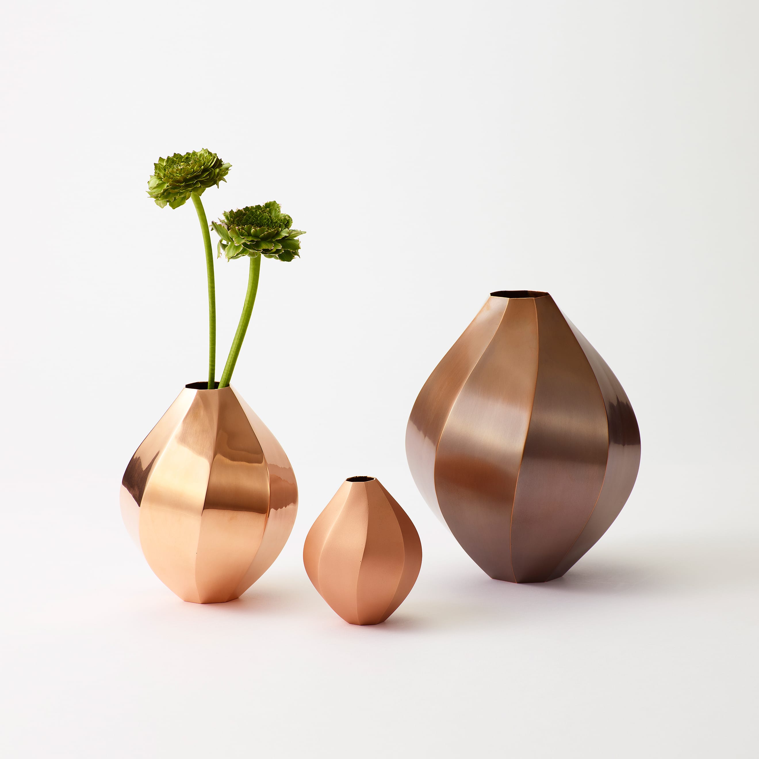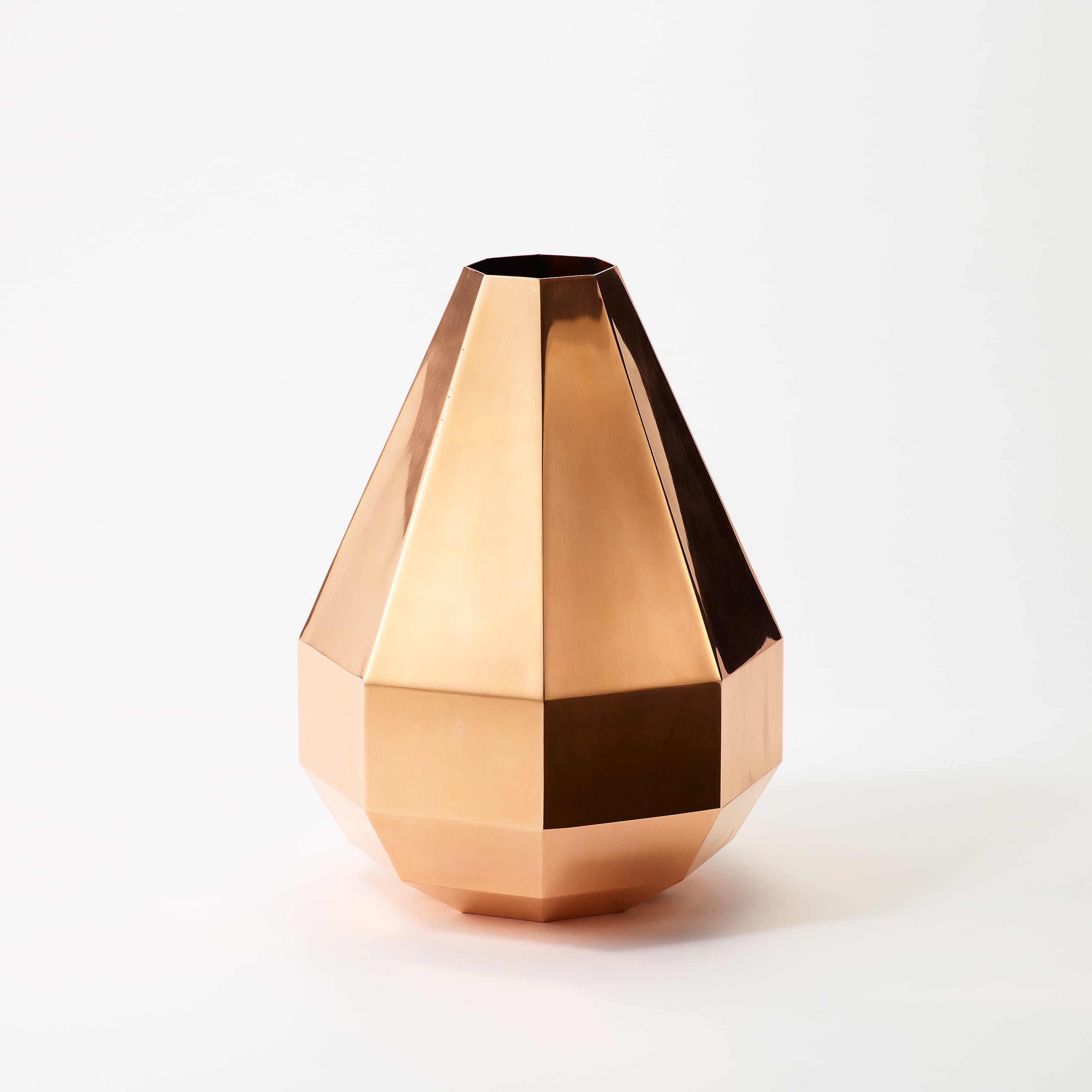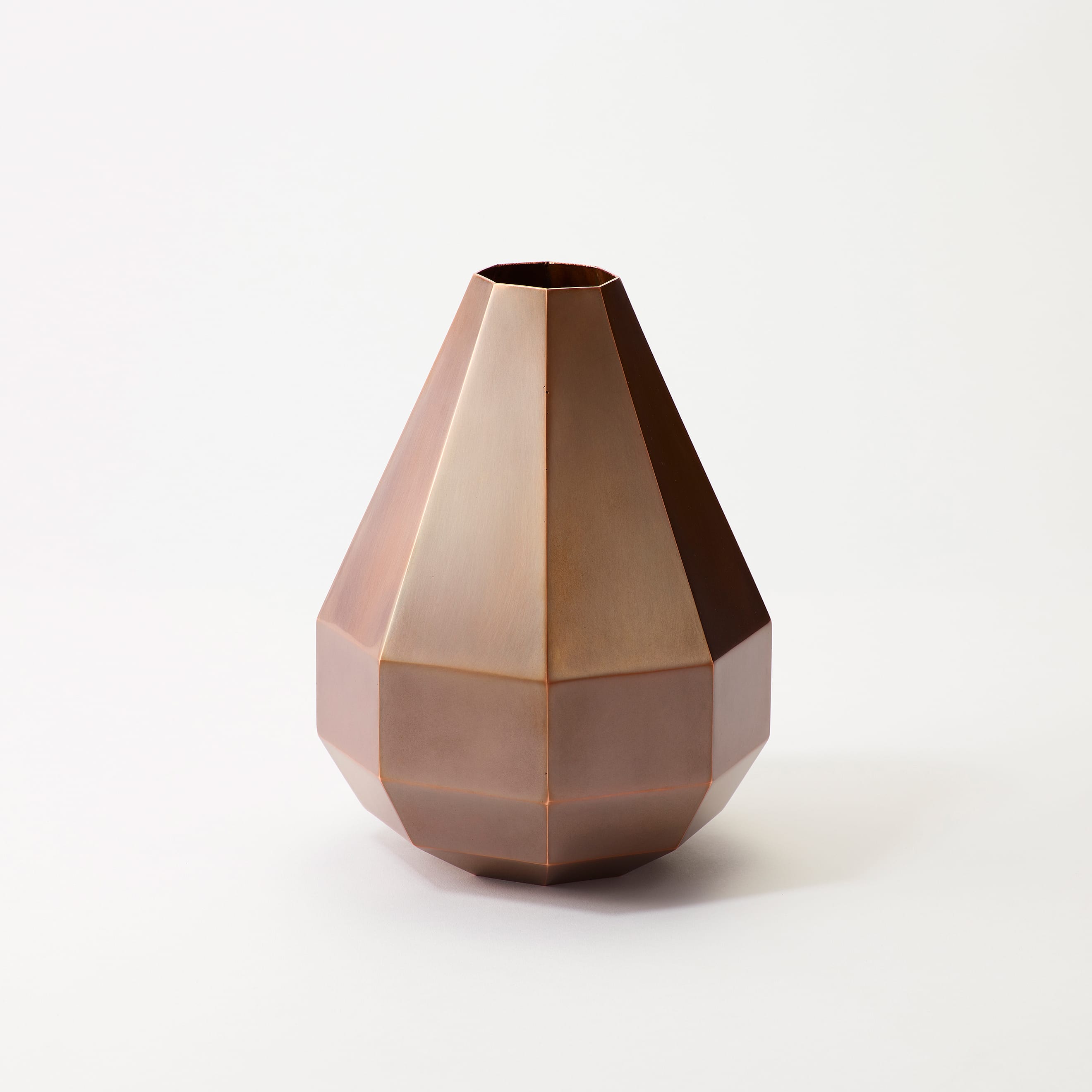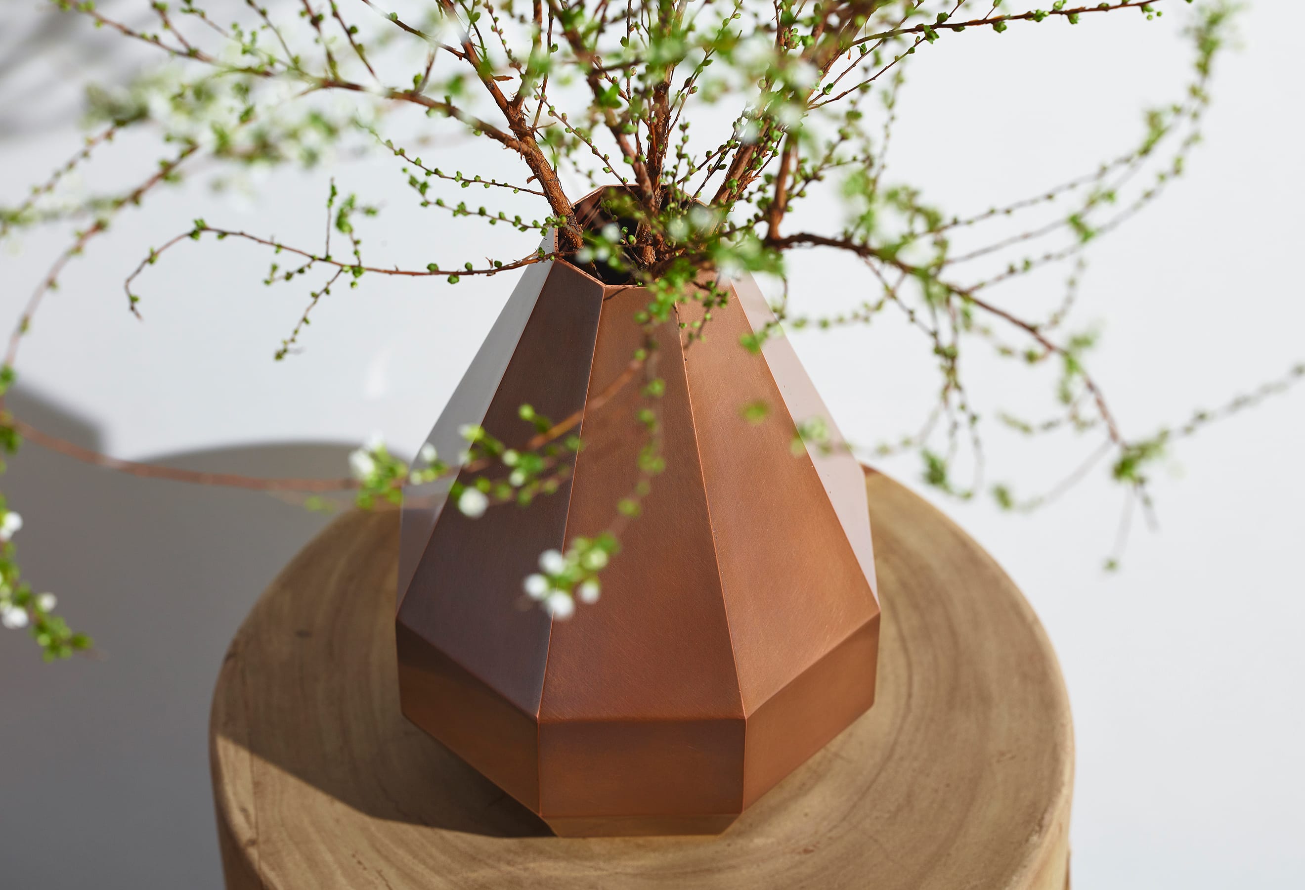The Octagon Vase is a copper vase with an octagonal cross-section at every point along its beautiful form—but there is more to it than meets the eye. Copper is a material known for its antimicrobial properties; when it comes into contact with water, it releases copper ions which suppress the growth of bacteria and other microorganisms. This helps keep water clean and makes it easier for flowers to absorb nutrients, resulting in fresher, longer-lasting blooms. The octagon has also been seen as an auspicious symbol since ancient times, believed to draw positive energy from all eight sides while warding off negative forces and misfortune. While copper is a notoriously difficult material to weld and manipulate, the skilled hands of our artisans have achieved a beautifully precise object defined by its sharp lines and clean planes.
