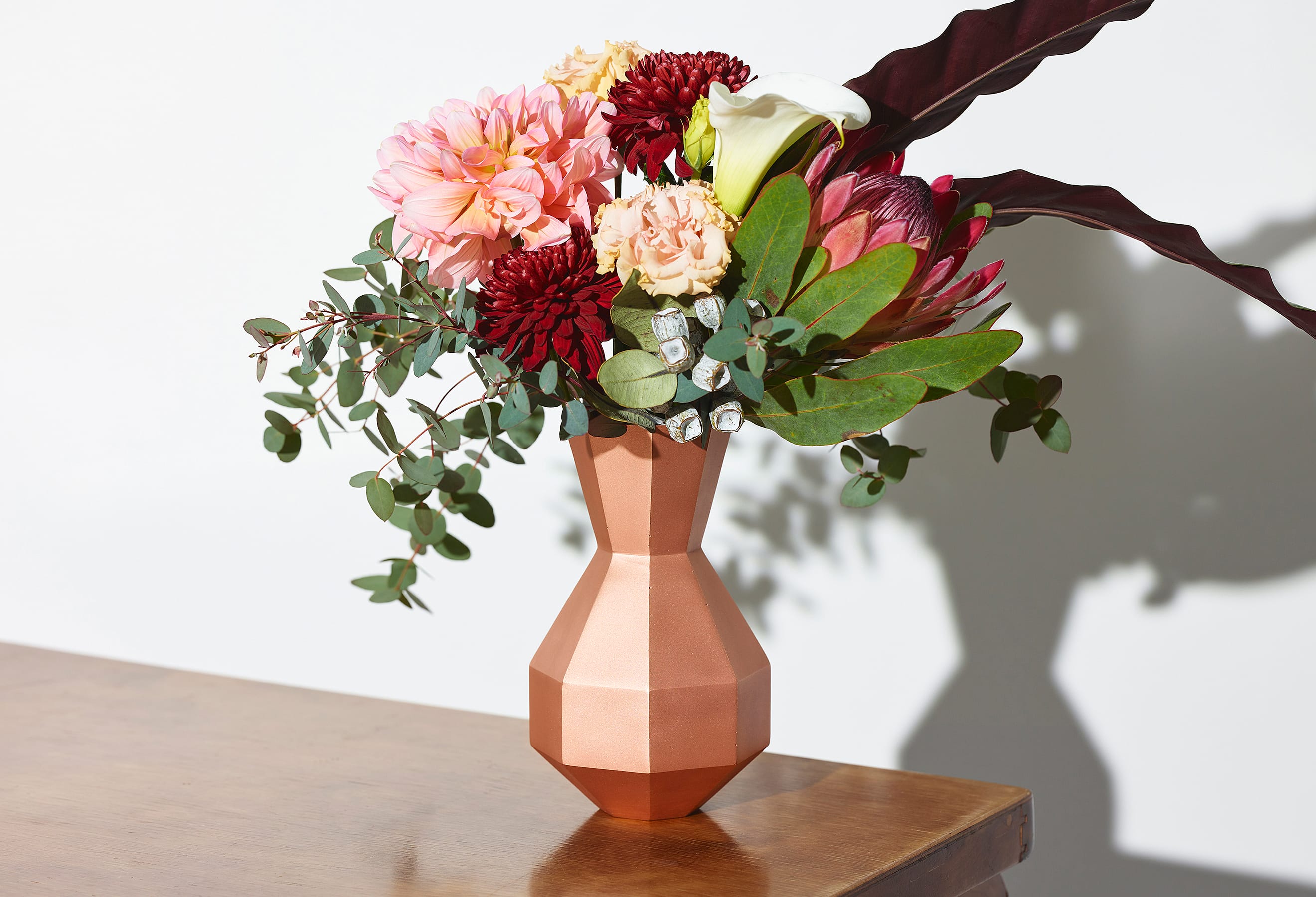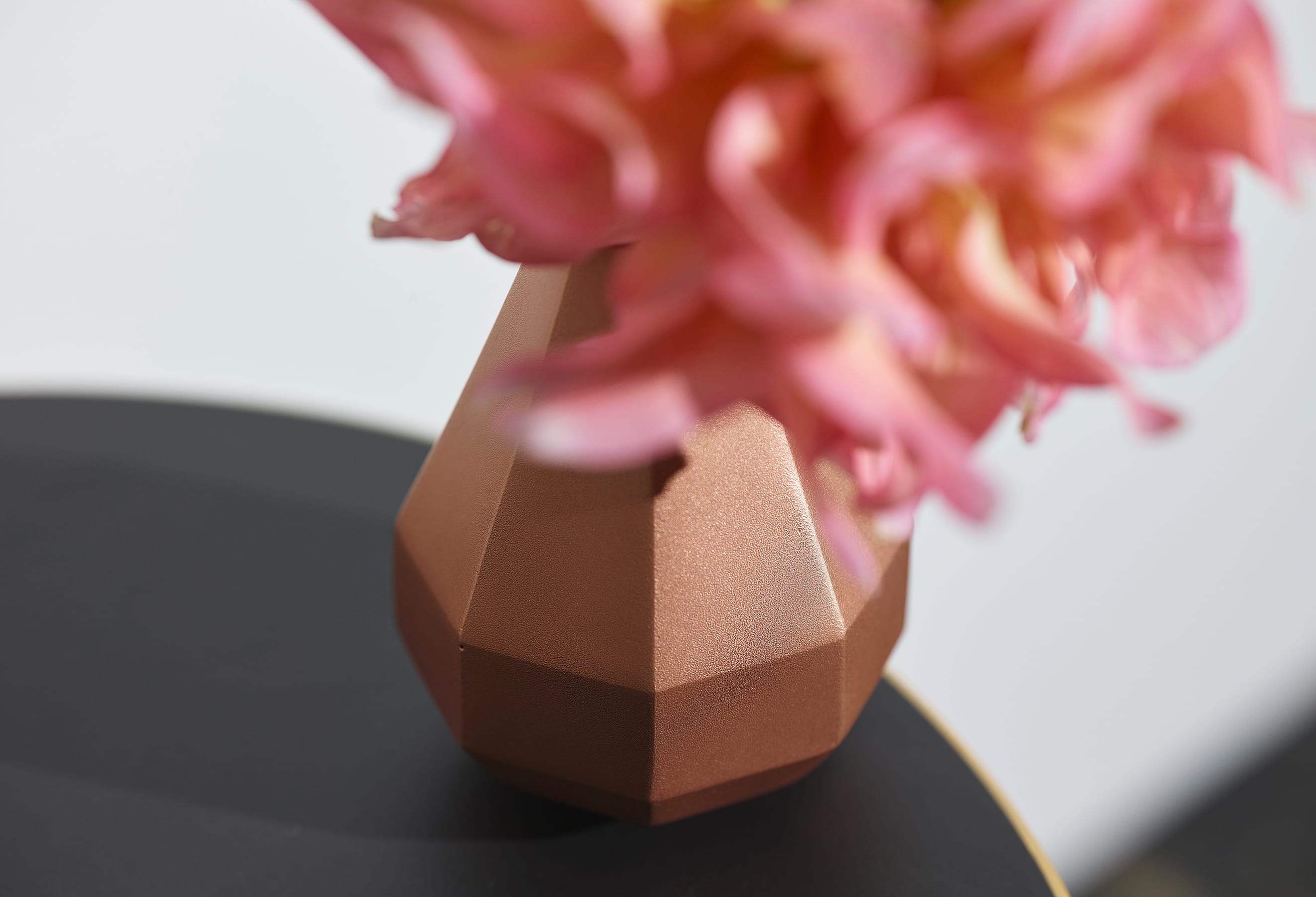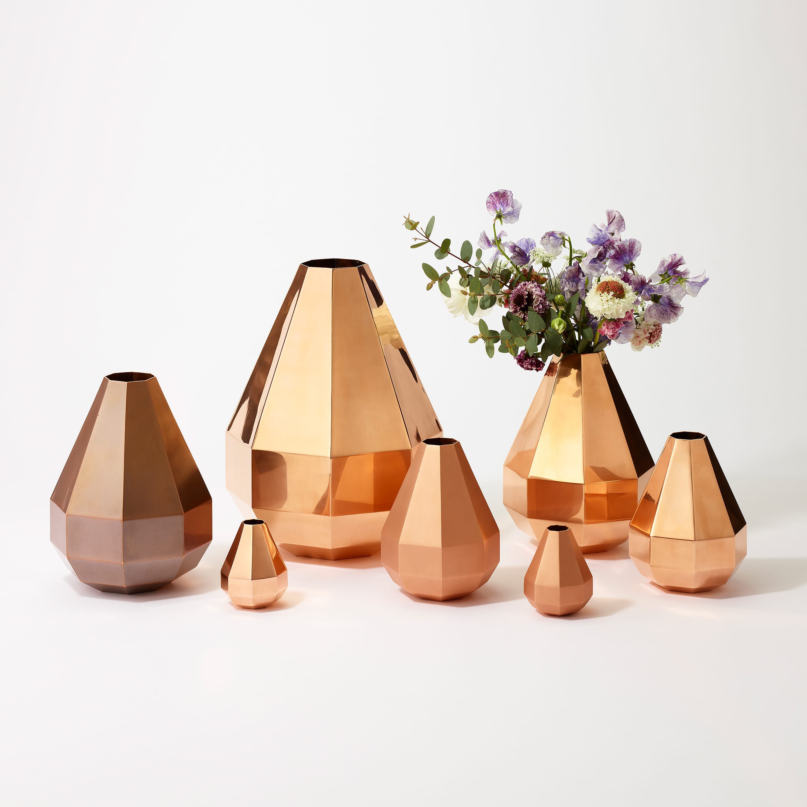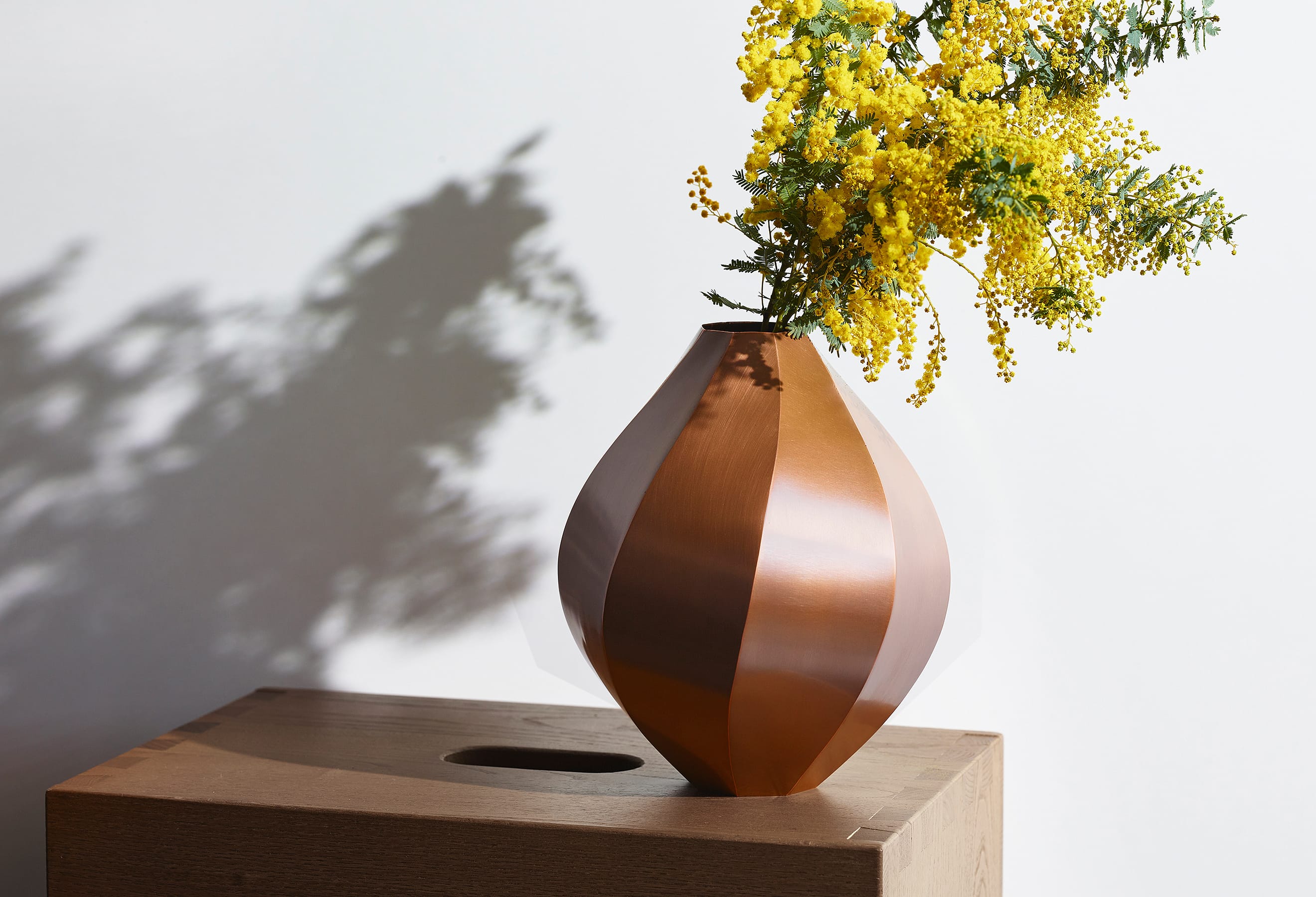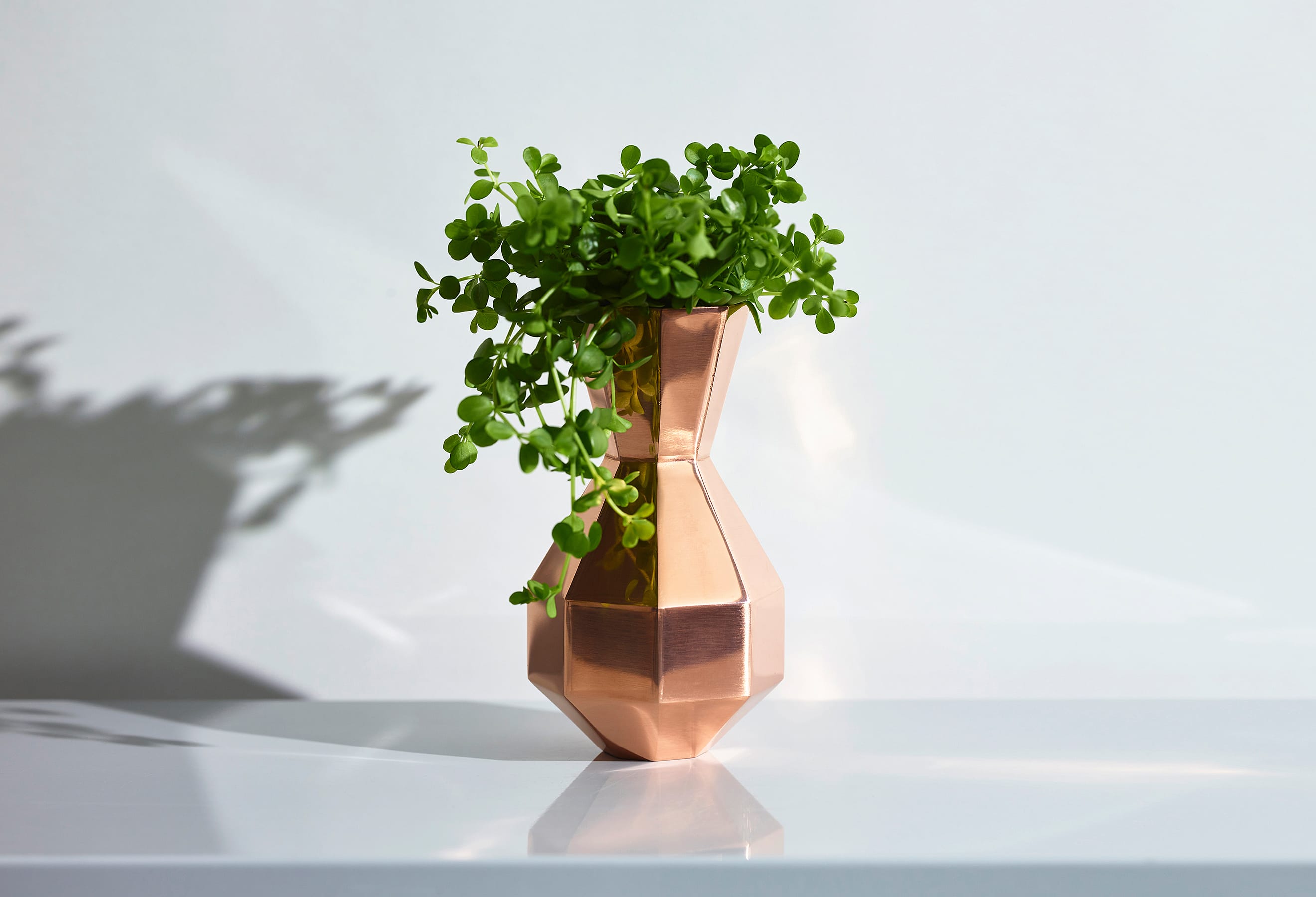 The Octagon Vase is a copper vase with an octagonal cross-section at every point along its beautiful form—but there is more to it than meets the eye. Copper is a material known for its antimicrobial properties; when it comes into contact with water, it releases copper ions which suppress the growth of bacteria and other microorganisms. This helps keep water clean and makes it easier for flowers to absorb nutrients, resulting in fresher, longer-lasting blooms. The octagon has also been seen as an auspicious symbol since ancient times, believed to draw positive energy from all eight sides while warding off negative forces and misfortune. While copper is a notoriously difficult material to weld and manipulate, the skilled hands of our artisans have achieved a beautifully precise object defined by its sharp lines and clean planes.